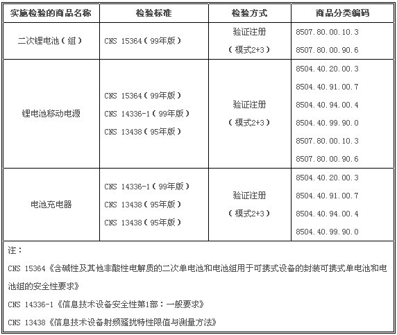 根據(jù)2013年7月26日的會議記錄,臺灣經(jīng)濟(jì)部標(biāo)準(zhǔn)檢驗(yàn)局(BSMI)將計算機(jī)、通訊和消費(fèi)電子三類產(chǎn)品(簡稱3C電子產(chǎn)品)中的二次鋰電池(組)、鋰電池移動電源和電池充電器納入其強(qiáng)制性商品檢驗(yàn)范圍,新規(guī)定將從2014年3月1日開始實(shí)施。